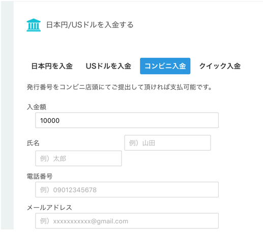 SMS認証と本人確認が完了したら、「日本円を入金する」メニューから「コンビニ入金」を選択します。