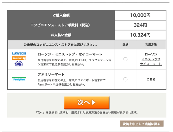 選択の欄の丸をクリックし、コンビニを選択してください。※利用方法は次の操作で確認できますので、こちらのページからはご確認いただかなくても大丈夫です。仮にファミリーマートを選択するとします。