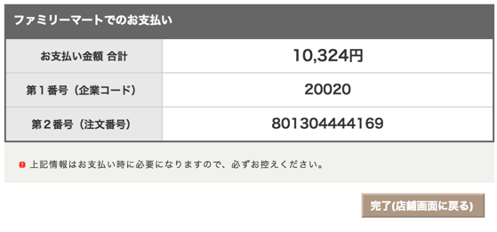 すると、お支払い金額と企業コード、注文番号が表示されます。決済に必要な番号ですので、お忘れないようご注意ください。